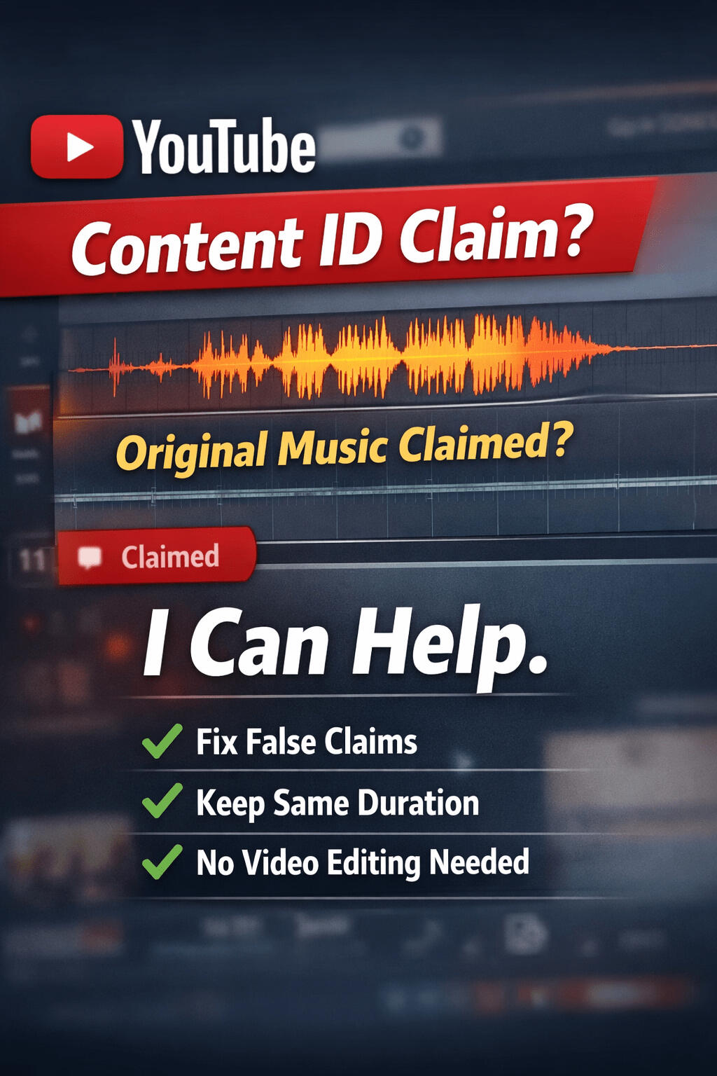 Most claims are triggered by automated fingerprinting systems. They often match your audio with similar tracks, even if you created it yourself. We analyze your file, remove problematic patterns, and deliver a clean version that won’t trigger Content ID.